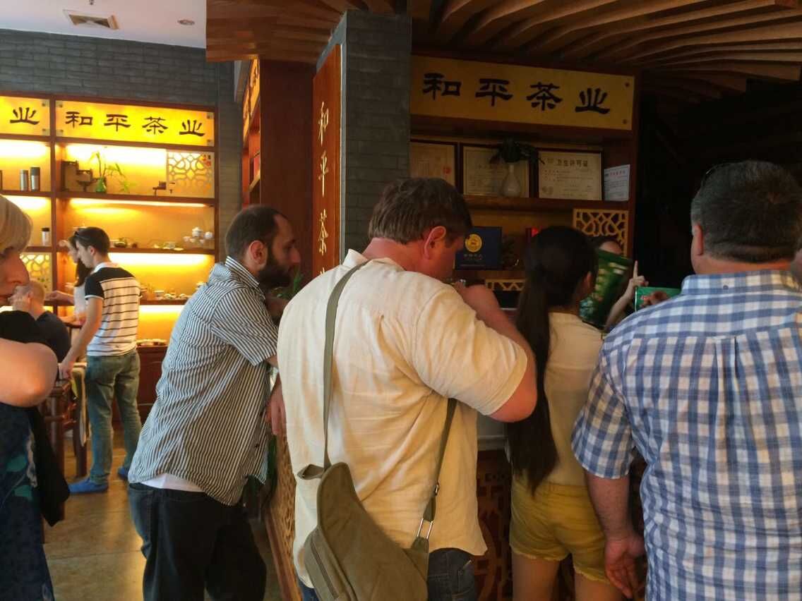 今天西影路和平茶叶专卖店迎来一批爱好中国文化、中国茶的外国友人。一行十几人浩浩荡荡的进到和平茶叶店,用蹩脚的中文表达他们对和平茶叶古色古色店铺装修风格的喜爱及赞美。