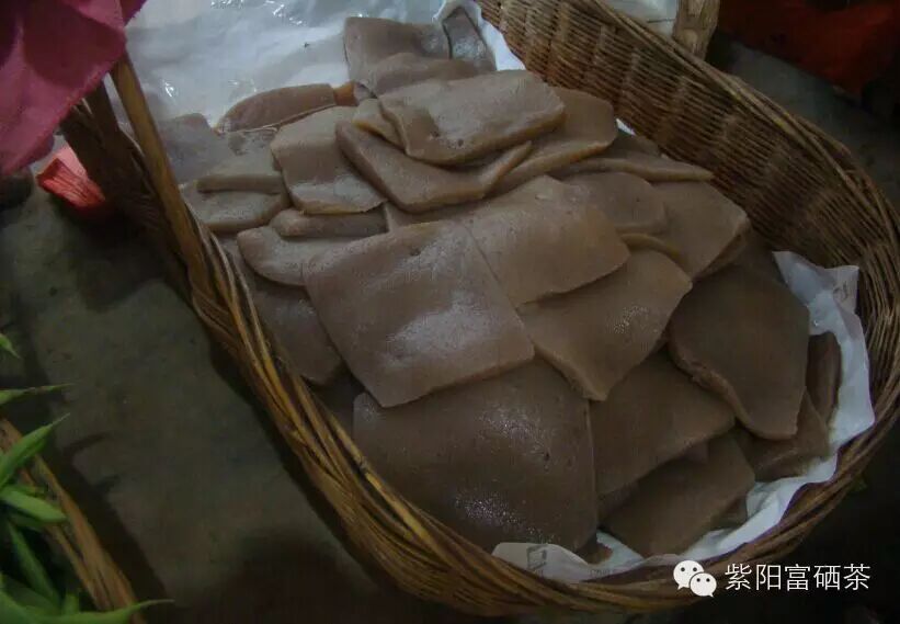 紫阳浆巴馍系桐叶包裹包谷浆和新麦面蒸就而成,其味微酥带甜又有桐叶的清香。